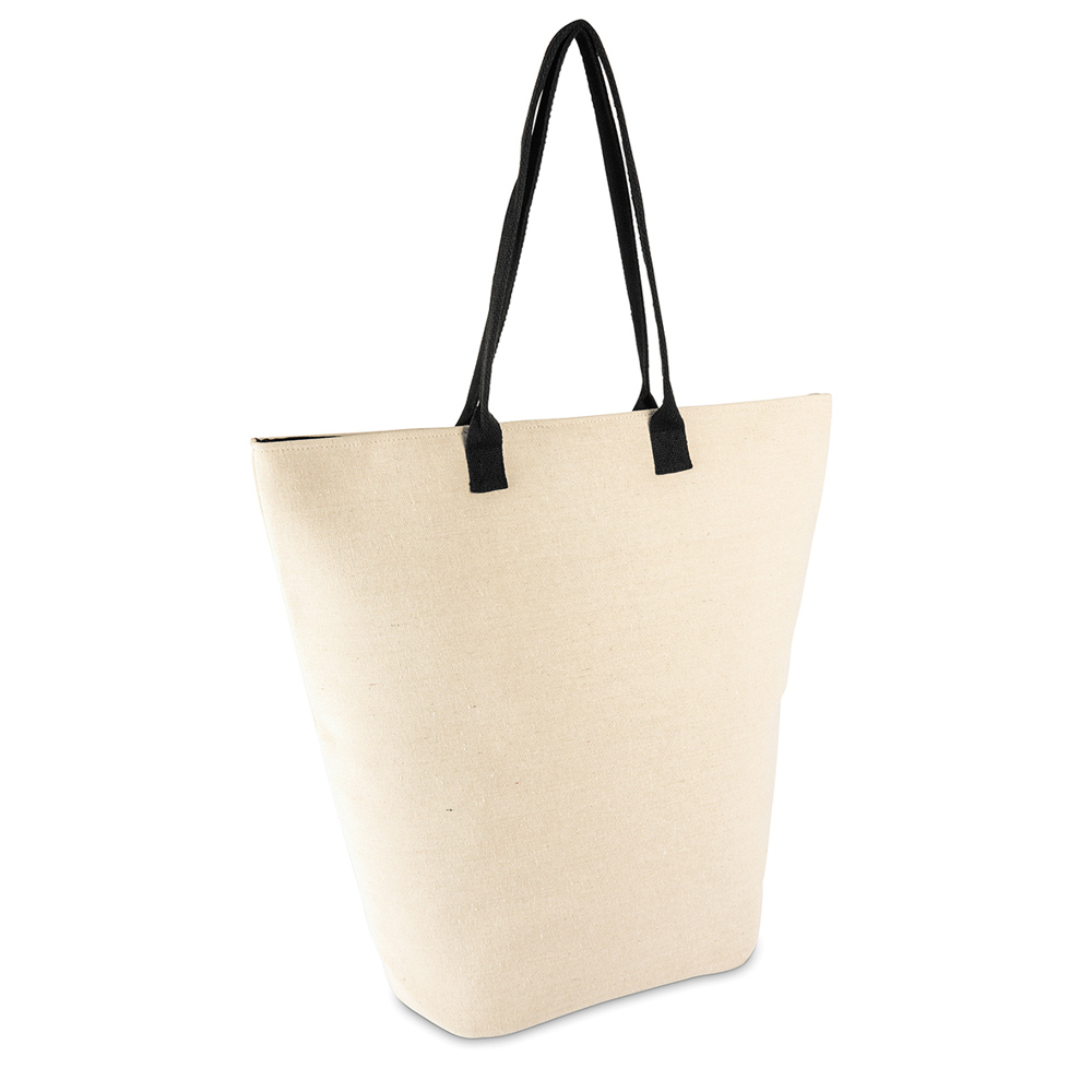 Die Tasche besteht aus 80% recycelter Baumwolle und 20% rPET. Er verfügt über ein Hauptfach, das mit einem Magnetknopf verschlossen wird, sowie ein offenes Innenfach. Mit einem Volumen von ca. 65 l bietet der Beutel viel Stauraum und ist sowohl praktisch als auch umweltfreundlich – ideal für den täglichen Gebrauch oder Ausflüge.