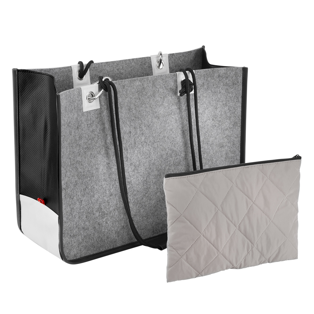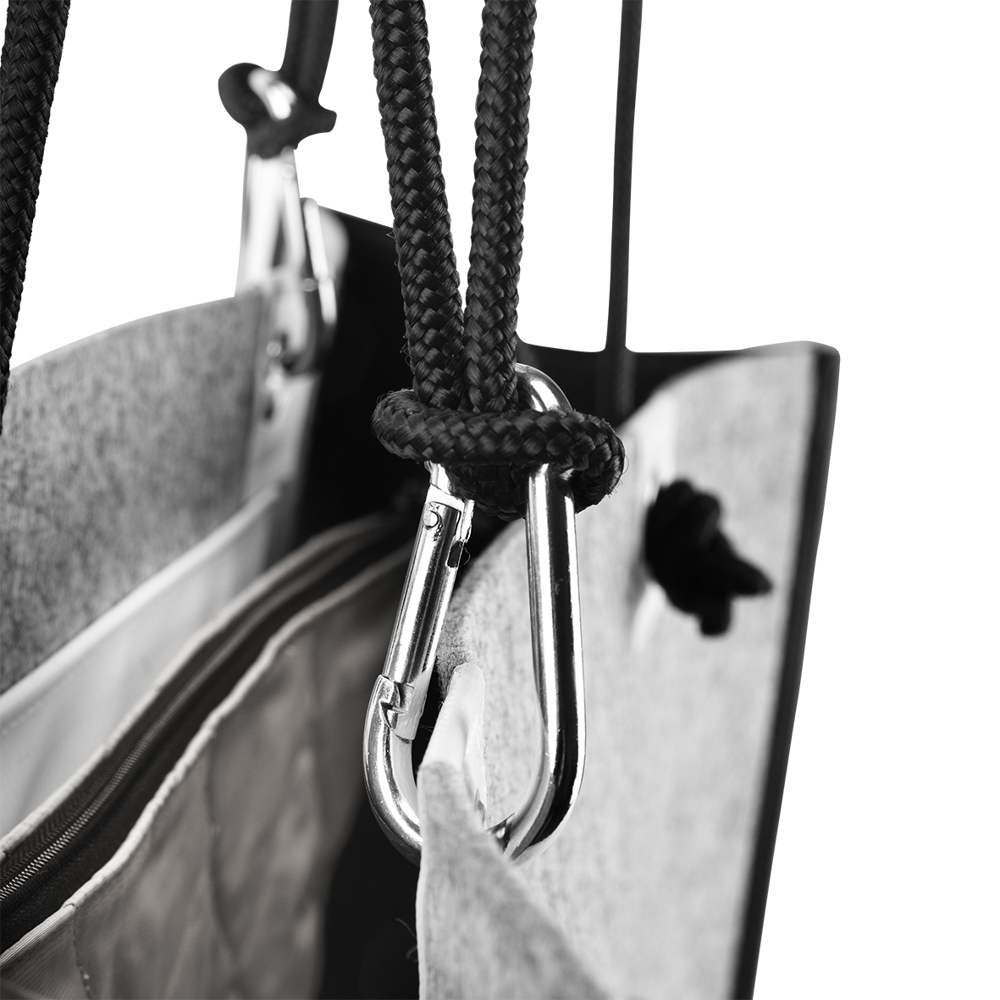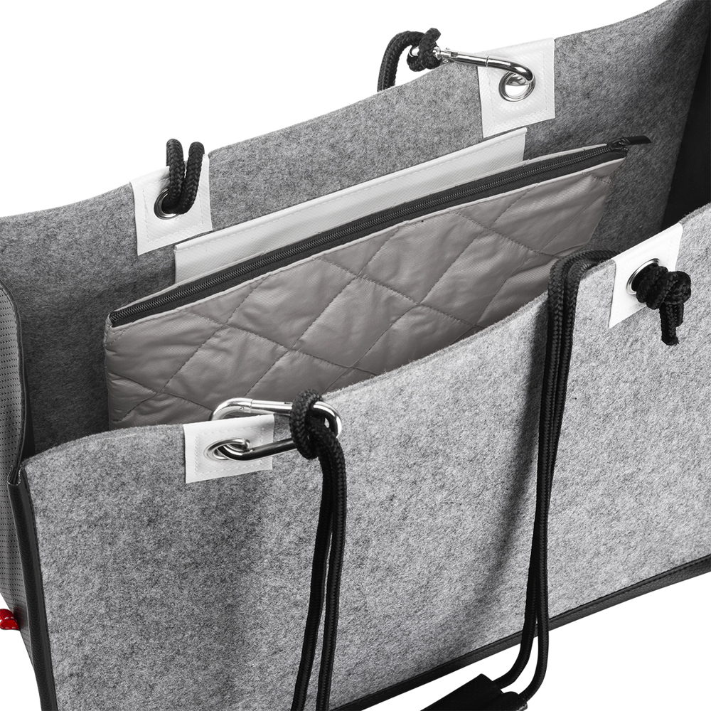 Die Tasche besticht durch einen interessanten Materialmix aus Filz, LKW-Plane und PU und verfügt über ein offenes Hauptfach. Eine Metallöse für Handschlaufen ist in Tarpaulin eingefasst. Die Tragegriffe sind aus rundgewebtem Polyester, während die Handgriffe in edlem PU mit Loch-Optik gestaltet sind. Die Innentasche aus 300D Nylon ist abnehmbar. Mit einem Volumen von 22,5 Litern bietet die Tasche ausreichend Platz und kombiniert praktische Funktionalität mit modernem Design.