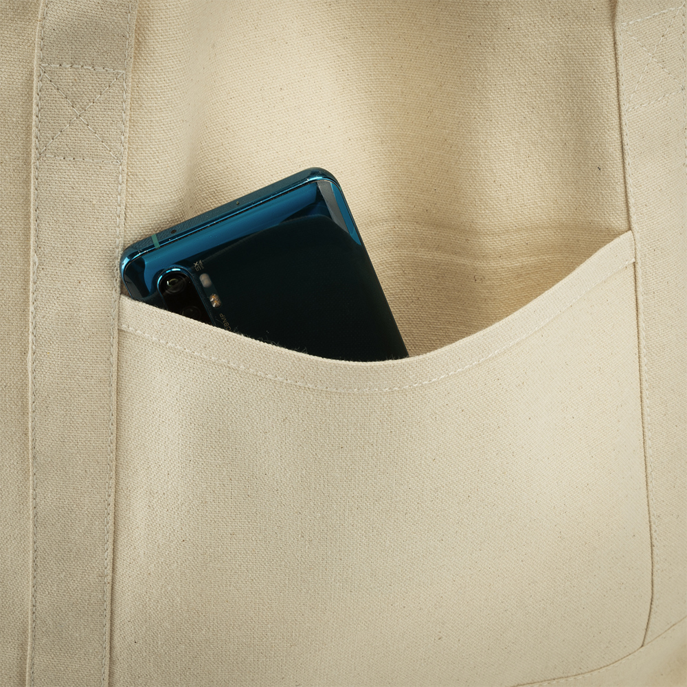 Diese Einkaufstasche besteht aus 100% recycelter Baumwolle (11oz, 320g/m²) und bietet eine hohe Stabilität und Nachhaltigkeit. Sie verfügt über ein offenes Hauptfach und eine praktische offene Vortasche (ca. 21 x 18 cm) für zusätzlichen Stauraum. Die stabilen Tragegriffe aus recycelter Baumwolle (ca. 70 x 3 cm) sorgen für Komfort und Langlebigkeit. Ideal für den täglichen Gebrauch.