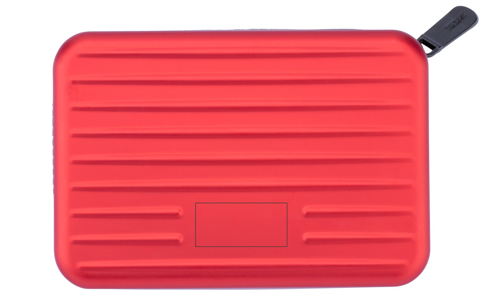 Kreditkartenetui im Stil eines Hartschalenkoffers, Reißverschluss, mit Ausleseschutz (für RFID Chips), 9 Fächer mit Platz für ca. 20 Karten, Geld und Belege, Aluminium, Polyester, matt, rot