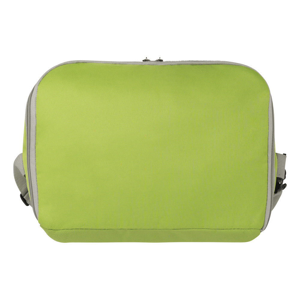 Kühltasche FROSTY: 1 Einsteckfach auf der Front, mit isoliertem Reißverschluss-Hauptfach, 2 seitliche Netz-Einsteckfächer, verstärkte Tragegriffe, verstell- und abnehmbarer Schultergurt – ideal für Picknick, Grillen und auf Reisen