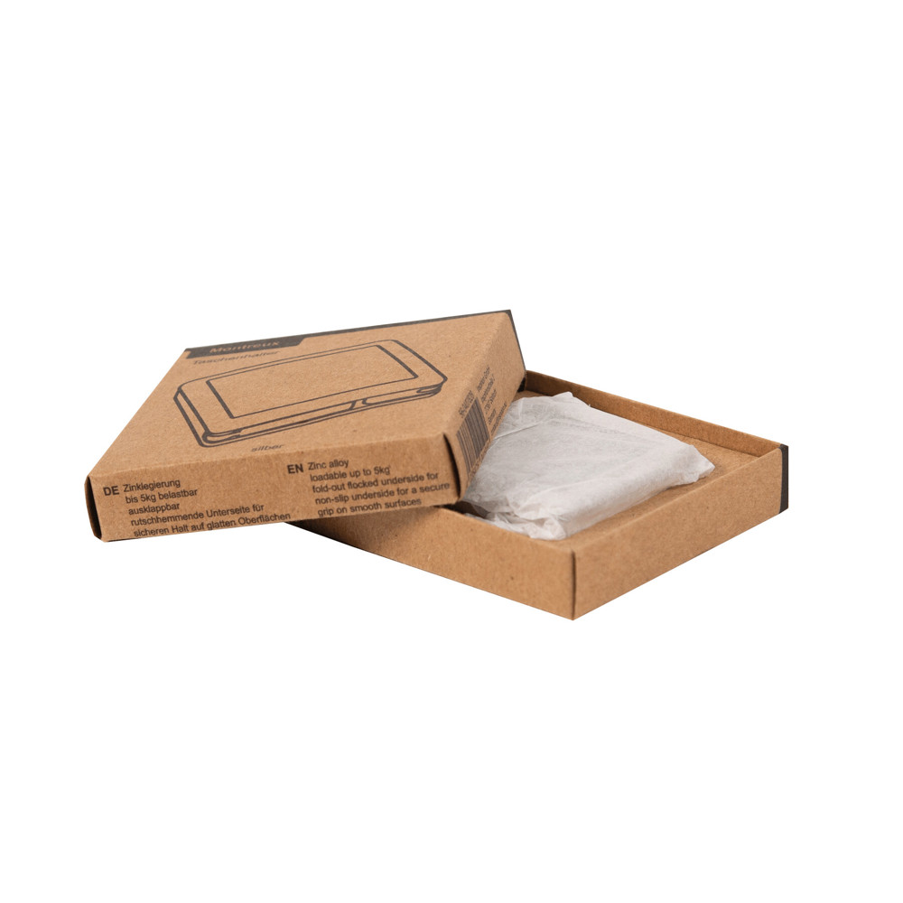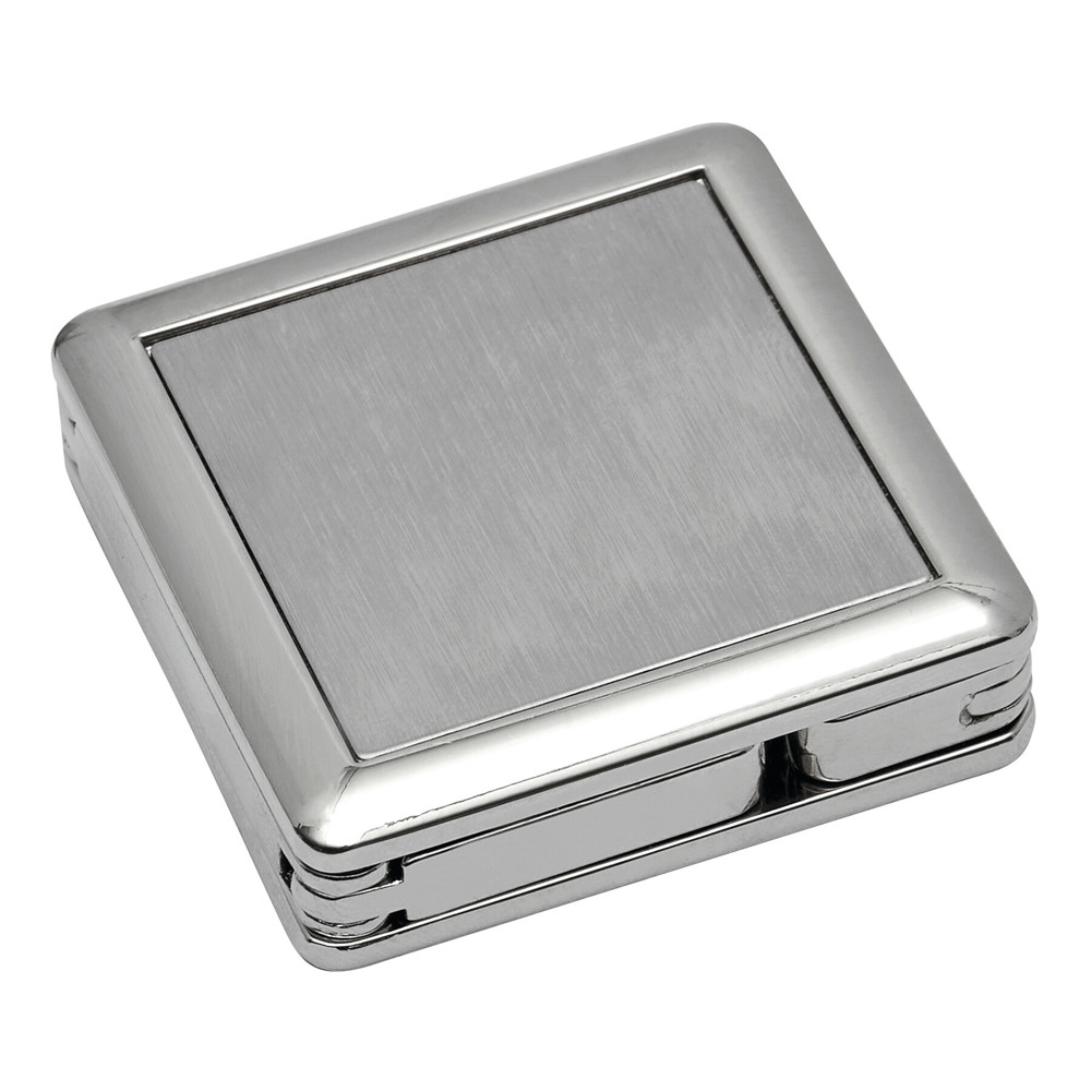 Handtaschen-Halter MONTREUX, ausklappbar: Oberseite aus Edelstahl für Werbeanbringung, gummierte Unterseite sorgt für sicheren Halt auf glatten Oberflächen, in Box