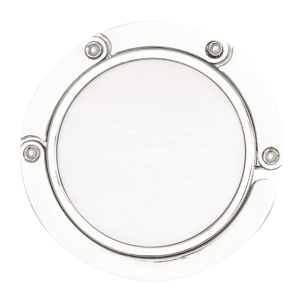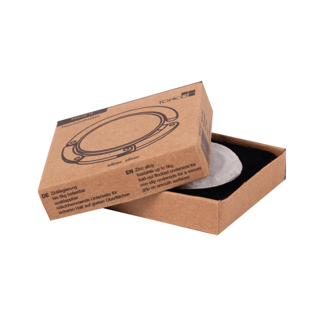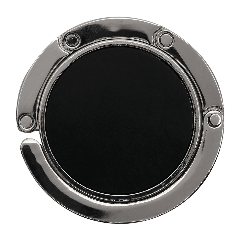 Handtaschenhalter HOLD IT, ausklappbar: Oberseite aus glänzendem Metall für Werbeanbringung, beflockte Unterseite sorgt für sicheren Halt auf glatten Oberflächen