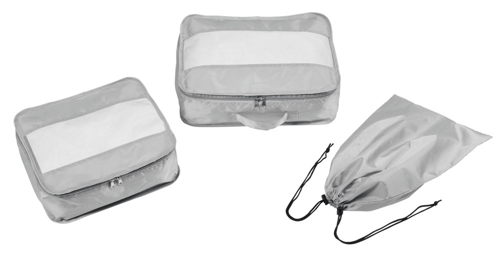 Reise-Set TRAVEL ATTENDANT, 3-teilig: bestehend aus 2 Kleidertaschen in unterschiedlichen Größen und 1 Schuhbeutel, Kleidertaschen mit Fenster aus Netzmaterial für eine leichte Einsicht und gute Belüftung, doppeltem Reißverschluss und die große Tasche hat zusätzlich einen Tragegriff, verschließbarer Schuhbeutel mit Kordelzugverschluss und 2 Kunststoffstoppern – für mehr Ordnung im Koffer