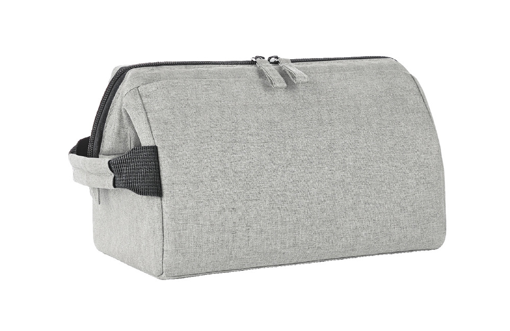 formschöne Reißverschlusstasche mit stabiler Metallbügelöffnung zum Aufstellen oder -hängen; rPET-Obermaterial; großes, gepolstertes Hauptfach mit diversen Organizer-Elementen; Reißverschlussvortasche; Handgriff