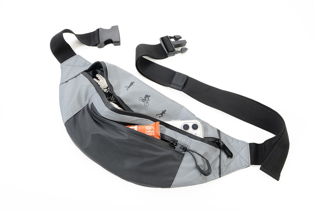 Gürteltasche mit 3 Reißverschlussfächern, reflektierend, kann über die Brust, den Rücken oder um die Hüfte getragen werden, Hauptfach, Frontfach, rückseitiges Geheimfach, Reißverschlüsse gummiert, spritzwassergeschützt (Wasserdichtheitsgrad IPX4), verstellbarer Gurt, gepolsterte Rückseite, 100% Polyester, Polyester, grau/schwarz