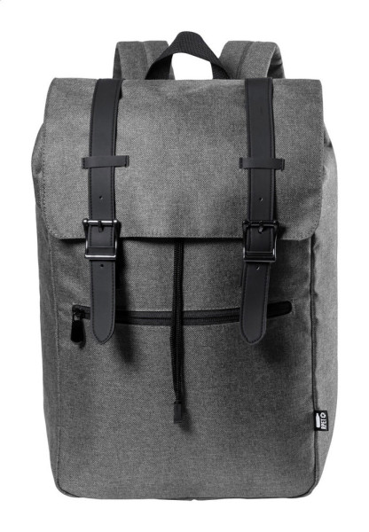 Rucksack aus RPET mit gepolstertem Laptop- (15") und Tabletfach (12"), Reißverschlusstasche Vorderseite, gepolstertem Rücken und Schultergurten. Hauptfach mit Kordelzug und magnetischem Druckknopfverschluss. Material: 300D RPET Polyester. Mit RPET-Label.
