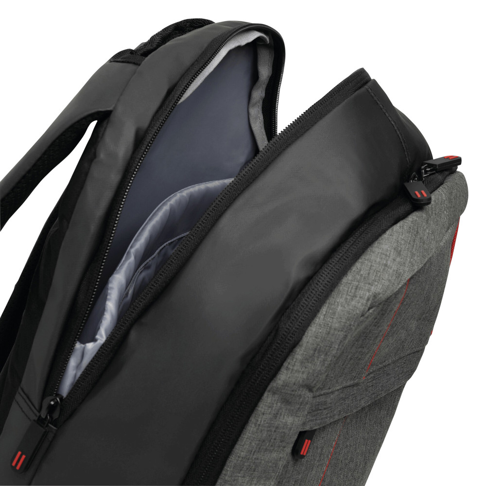 Rucksack SPLIT: 1 Reißverschluss-Vorfach, 2 Reißverschluss-Hauptfächer, ein Hauptfach mit gepolstertem Laptopfach und 1 Einsteckfach, das andere Hauptfach mit kleinem Organizer, Tragegriff, gepolsterte Schultergurte und Rückenbereich