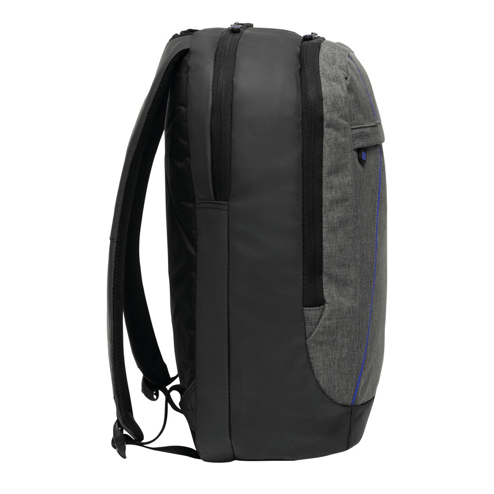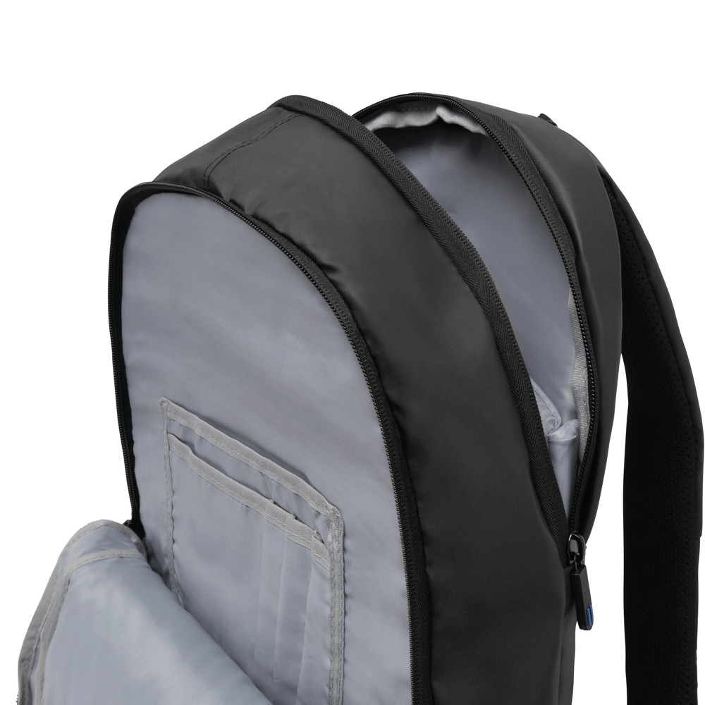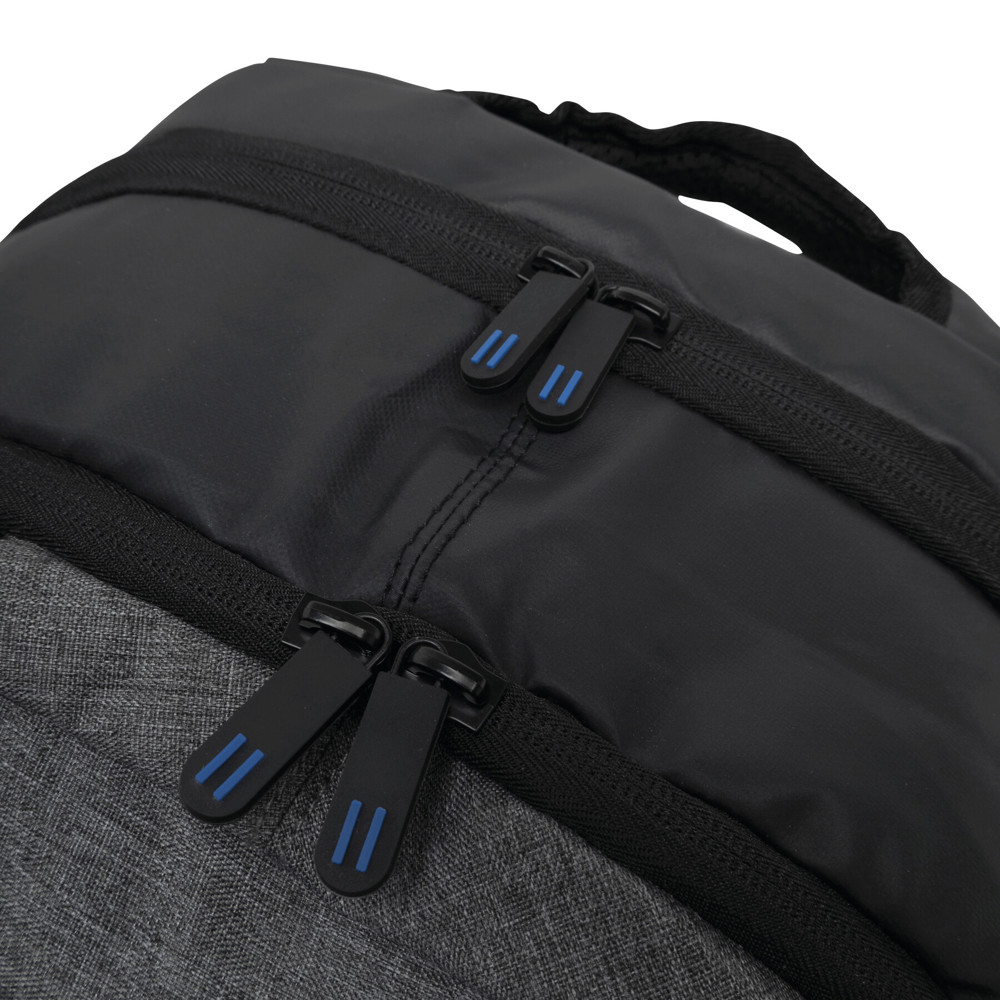 Rucksack SPLIT: 1 Reißverschluss-Vorfach, 2 Reißverschluss-Hauptfächer, ein Hauptfach mit gepolstertem Laptopfach und 1 Einsteckfach, das andere Hauptfach mit kleinem Organizer, Tragegriff, gepolsterte Schultergurte und Rückenbereich