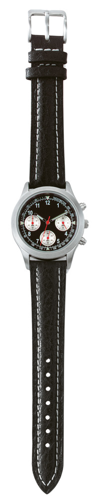 Ausstattung: Gehäusetiefe: 9,5 mm, Uhrwerk: VD 54, Zifferblatt scharz Index weiß, Stundenapplikationen weiß/ Leuchtindex, Zeiger 4 h/min silber/leuchtend sek rot, Gehäuseboden Edelstahl, 3 ATM waterproof, Echtlederarmband G1 gepolstert, scharz 18 mm, Augen silber Index schwarz Zeiger rot
