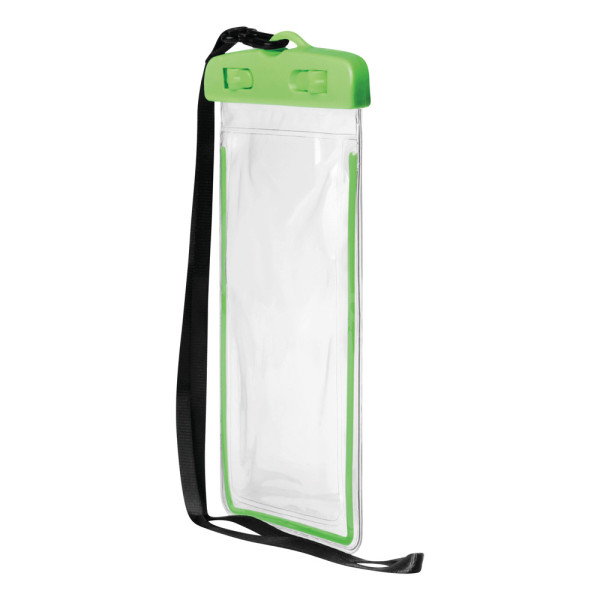Tasche DIVER, spritzwassergeschützt: transparent, mit sicherem Verschluss, umlaufende Streifen leuchten im Dunkeln, mit schwarzem Unhängeband (ca. 43 cm) - ideal für Strand und Badesee zum Verstauen von Dokumenten sowie anderen Wertgegenständen