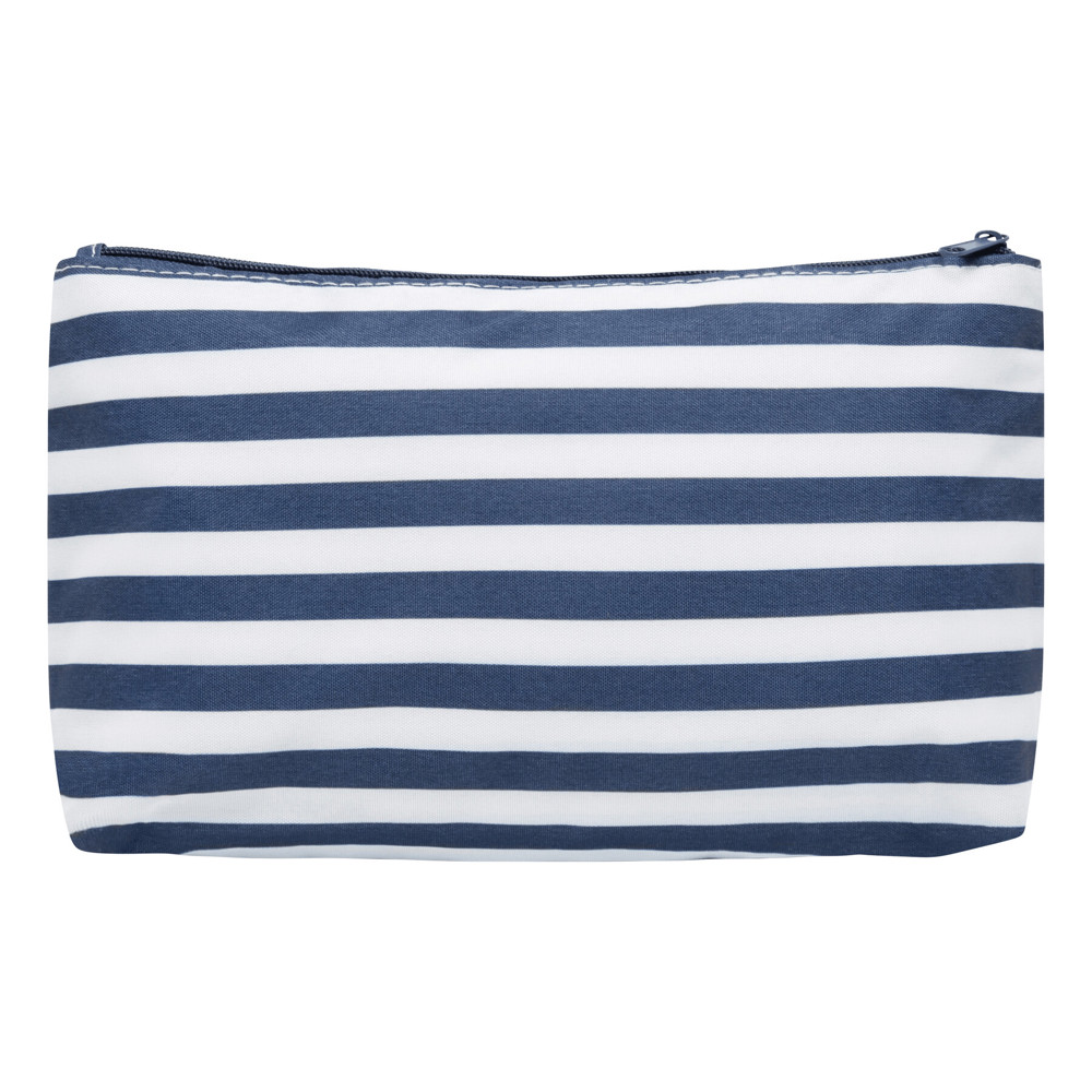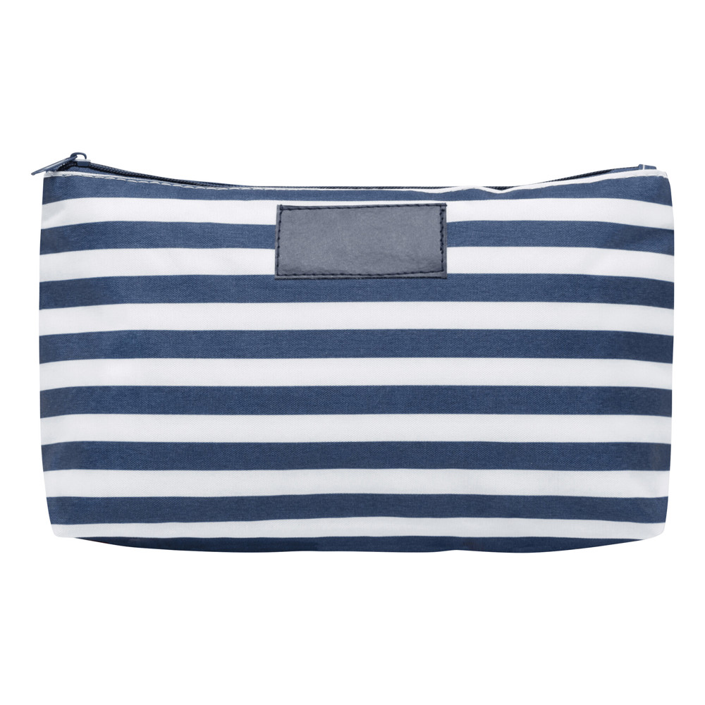 Kulturbeutel STRIPY: Hauptfach mit Reißverschluss, innen ein kleines Reißverschluss-Fach, Kosmetiktasche außen im maritimen Streifen-Look und mit Kunstleder-Applikation auf der Front für eine Werbeanbringung – ideal für Kosmetik und Pflegeartikel